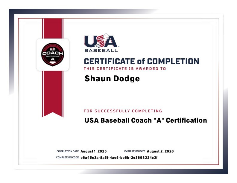 Coach Airen has also completed the USA Baseball Coach "A" Certification. We've been honored to have him working with us for a few seasons now and look forward to many more. Thank you, Coach Airen.